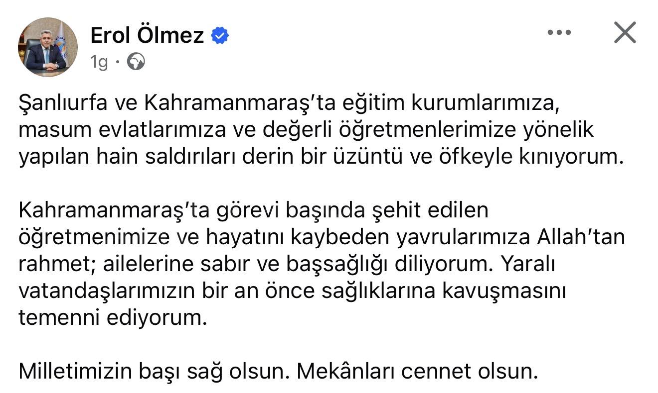 “Şanlıurfa ve Kahramanmaraş’ta eğitim kurumlarımıza, masum evlatlarımıza ve değerli öğretmenlerimize yönelik yapılan hain saldırıları derin bir üzüntü ve öfkeyle kınıyorum. Kahramanmaraş’ta görevi başında şehit edilen öğretmenimize ve hayatını kaybeden yavrularımıza Allah’tan rahmet; ailelerine sabır ve başsağlığı diliyorum. Yaralı vatandaşlarımızın bir an önce sağlıklarına kavuşmasını temenni ediyorum. Milletimizin başı sağ olsun. Mekanları cennet olsun.”