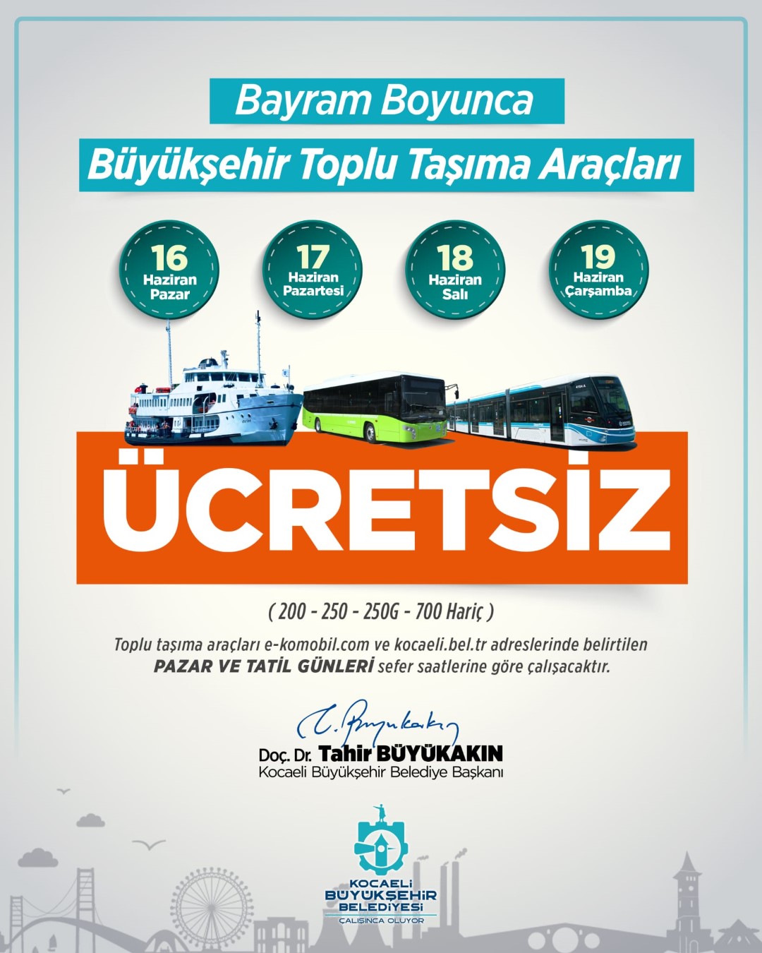 Kocaeli Büyükşehir Belediyesi, Kurban Bayramı süresince vatandaşların ulaşımlarını sorunsuz bir şekilde sağlamak amacıyla ücretsiz ulaşım hizmeti verecek. Bu kapsamda vatandaşlar Kurban Bayramı’nın birinci günü olan 16 Haziran Pazar günü ile 19 Haziran Çarşamba gününe kadar 4 gün boyunca ücretsiz ulaşımdan yararlanabilecek.