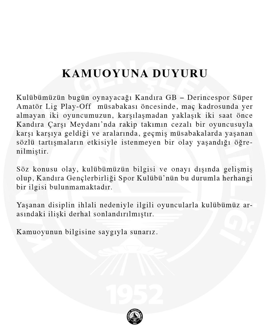 Saha dışında yaşanan bu vahim olayların ardından ev sahibi Kandıra Gençlerbirliği yönetimi vakit kaybetmeden harekete geçti. Olayların kulübün inisiyatifi dışında geliştiğini belirten yönetim, kavgaya karışan oyuncuların biletini derhal kesti. Kulüpten yapılan resmi açıklamada şu ifadelere yer verildi: