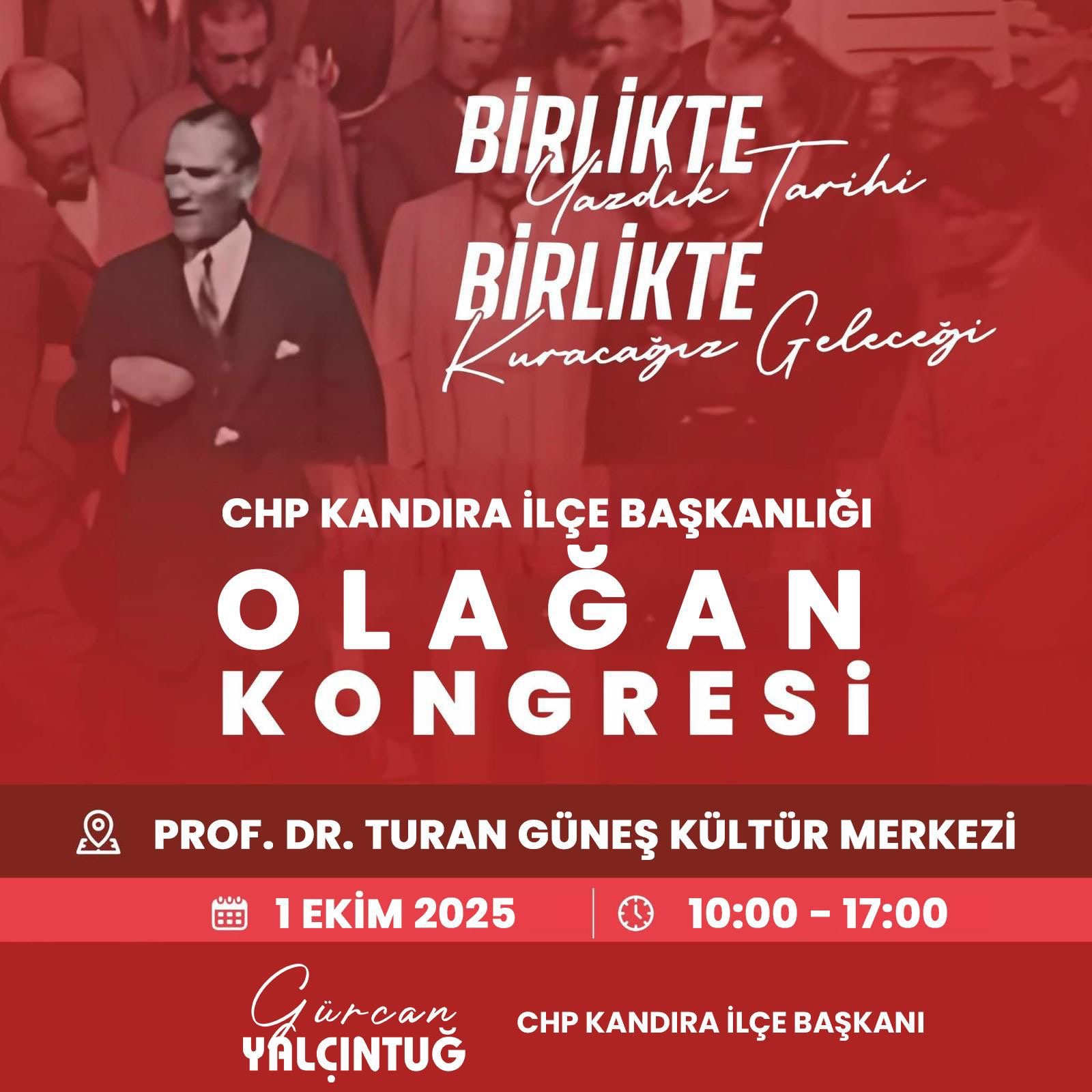 Kongrenin duyuru afişinde “Birlikte yazdık tarihi, birlikte kuracağız geleceği” sloganı yer aldı. CHP Kandıra İlçe Başkanı Gürcan Yalçıntuğ’un imzasıyla paylaşılan afişte, üyeler ve delegeler kongreye davet edildi.