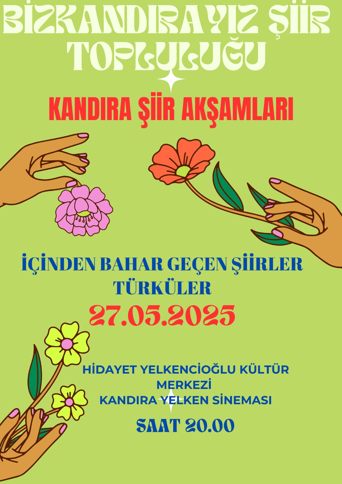 Kandıra, sanat dolu bir akşama hazırlanıyor. BizKandırayız Şiir Topluluğu tarafından düzenlenen “Kandıra Şiir Akşamları”, 27 Mayıs Salı günü sanatseverlerle buluşacak.