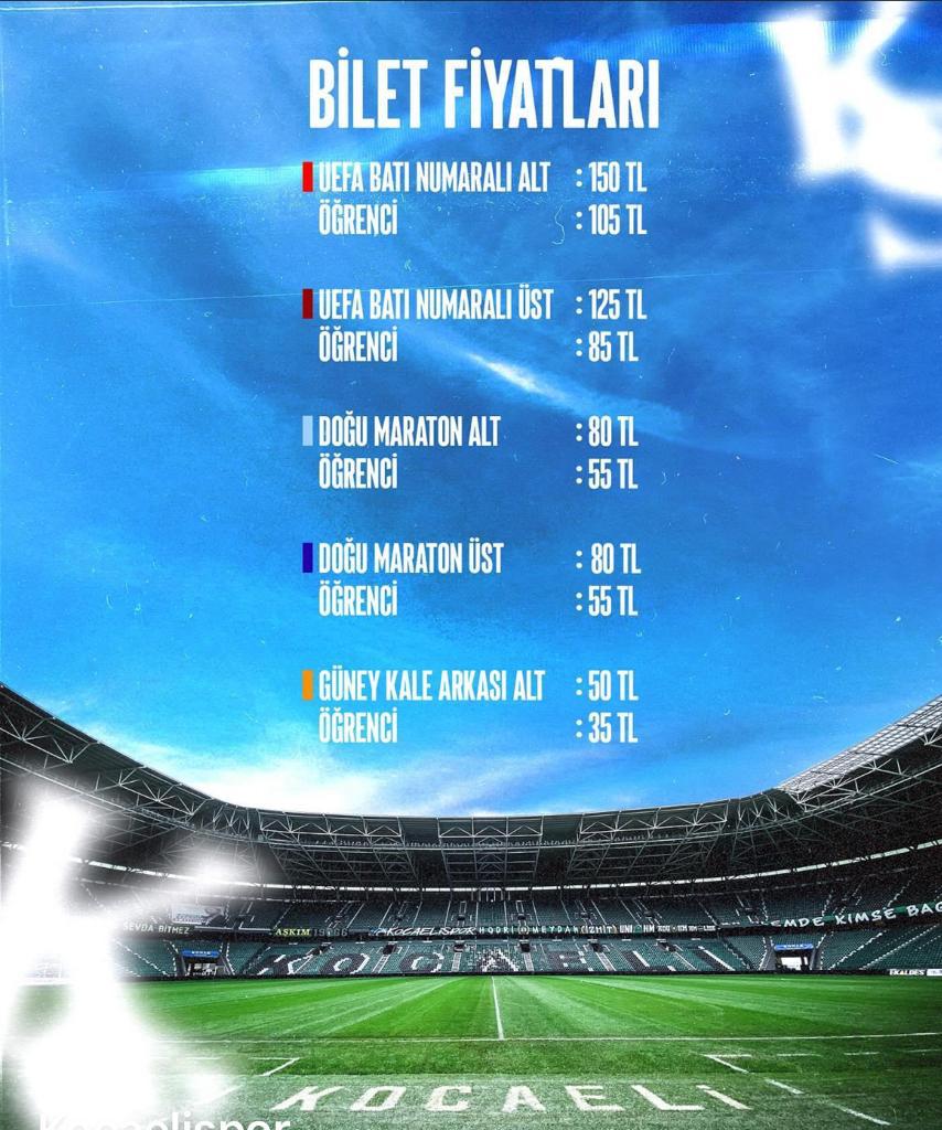1 Ekim Pazar günü Yıldız Entegre Kocaeli Stadyumu’nda saat 16.00’da oynanacak karşılaşmanın bilet fiyatları şöyle;